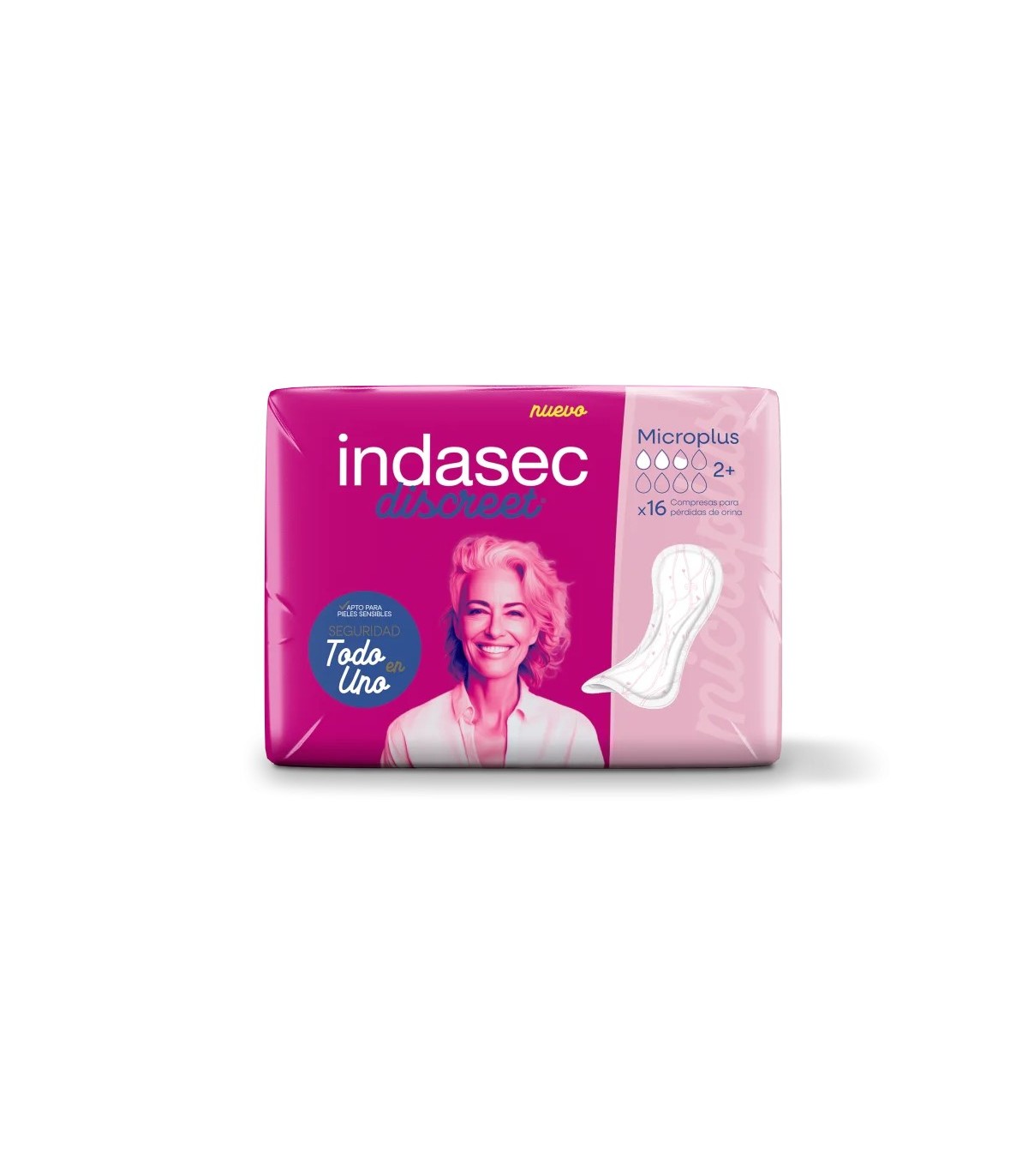 Protector para pérdidas leves con forma anatómica, que se ajusta a la prenda interior por medio de una banda adhesiva, para impedir desplazamientos.