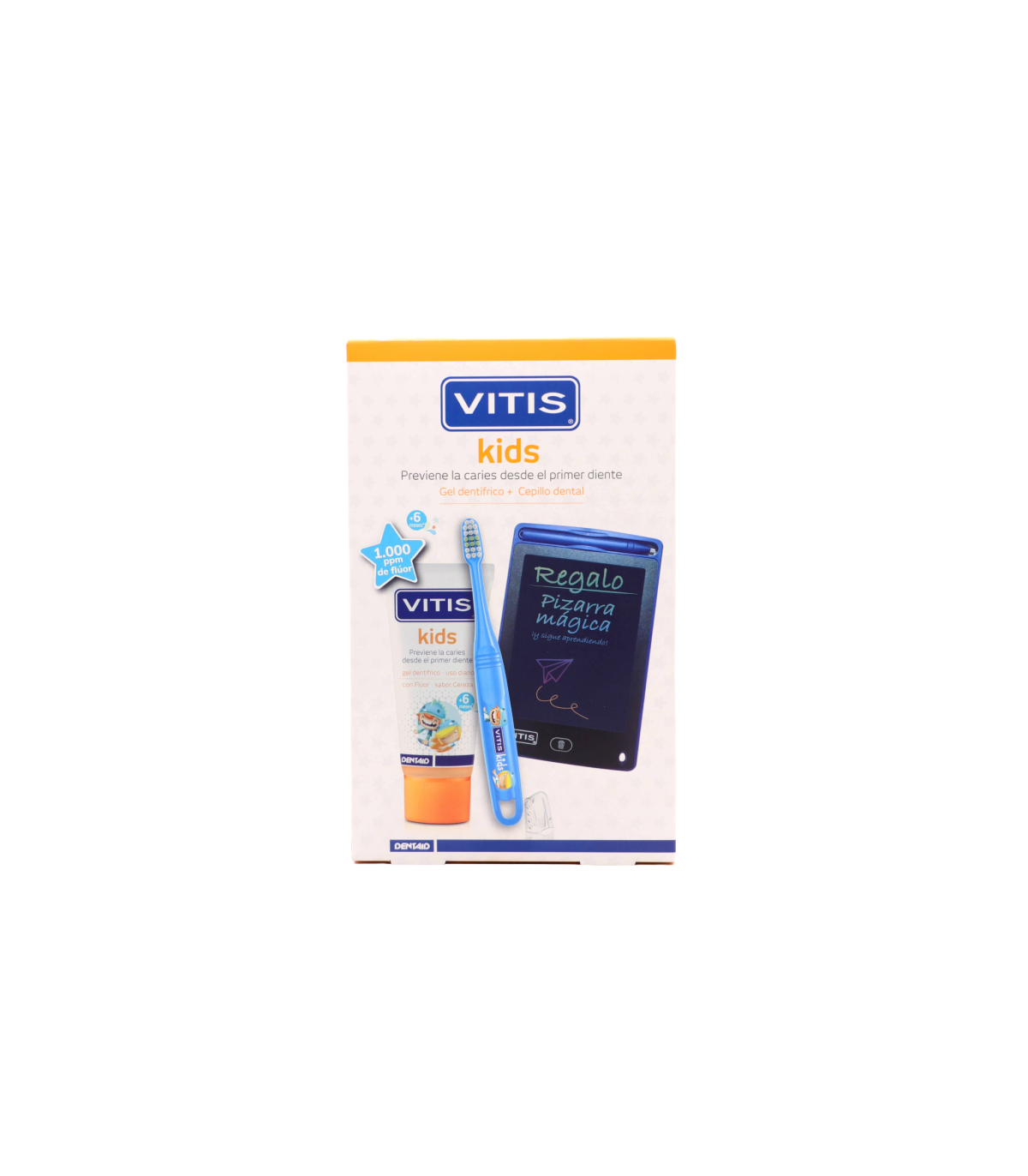 Este pack contiene un cepillo vitis kids,un gel dentifrico vitis kids y una pizarra mágica de regalo.