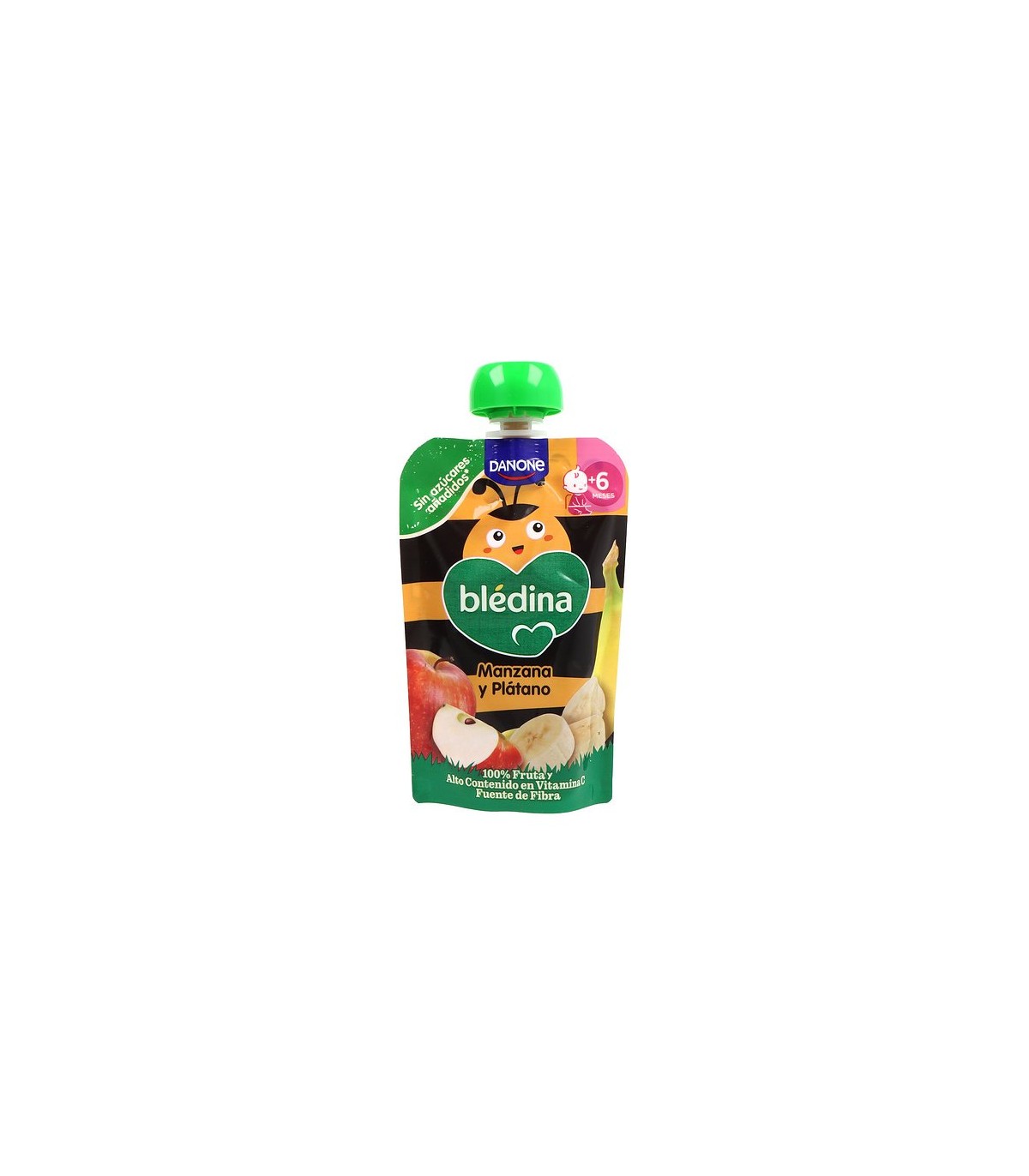 Pouch de puré de manzana y plátano 100 g, listo para tomar. Elaborado con fruta seleccionada, sin conservantes ni colorantes, ideal como merienda o complemento en la alimentación infantil.