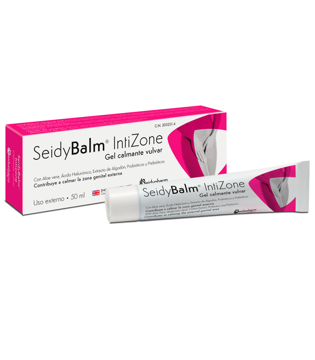 SeidyBalm® IntiZone, Gel para el cuidado femenino íntimo con Aloe vera, Ácido hialurónico, Extracto de Algodón, Probióticos (Lactobacillus) y Prebióticos, calma e hidrata la zona vulvar. Además, ayuda a mantener la elasticidad de la piel, gracias a sus propiedades lubricantes.